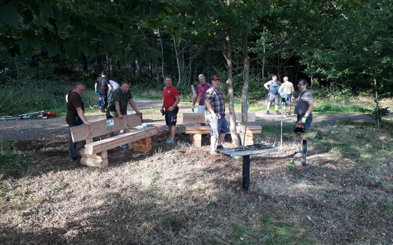 Am 9. September 2021 kamen zwei der neuen Bänke am Waldrand auf der Juchhöh dazu, wobei es diesmal mit dem reinen Aufstellen nicht getan war. Denn der extrem zugewucherte Platz musste erst einmal wieder freigelegt werden, was selbstverständlich im Vorhinein mit dem SaarForst abgestimmt wurde.